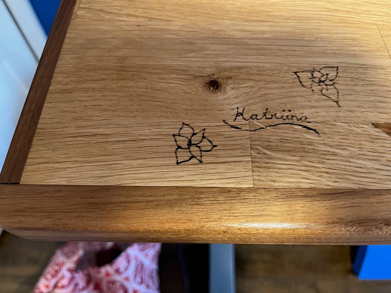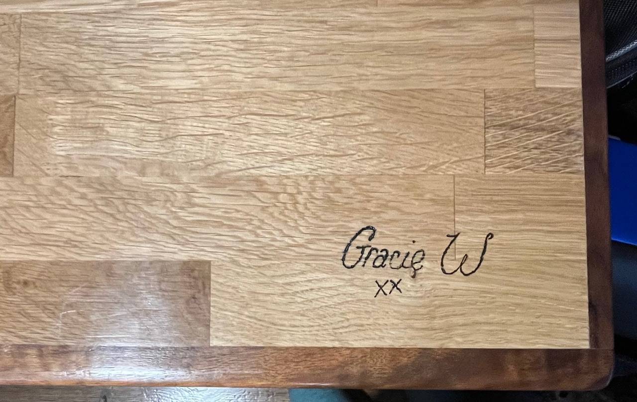 Over the course of the year it got a bit grubby, and picked up some moisture which raised the grain. So I re-finished the area from the front edge to about a foot in. This would have meant losing the signatures I got my kids to write on it with sharpies, so I got them to re-do their marks with my pyrography machine.