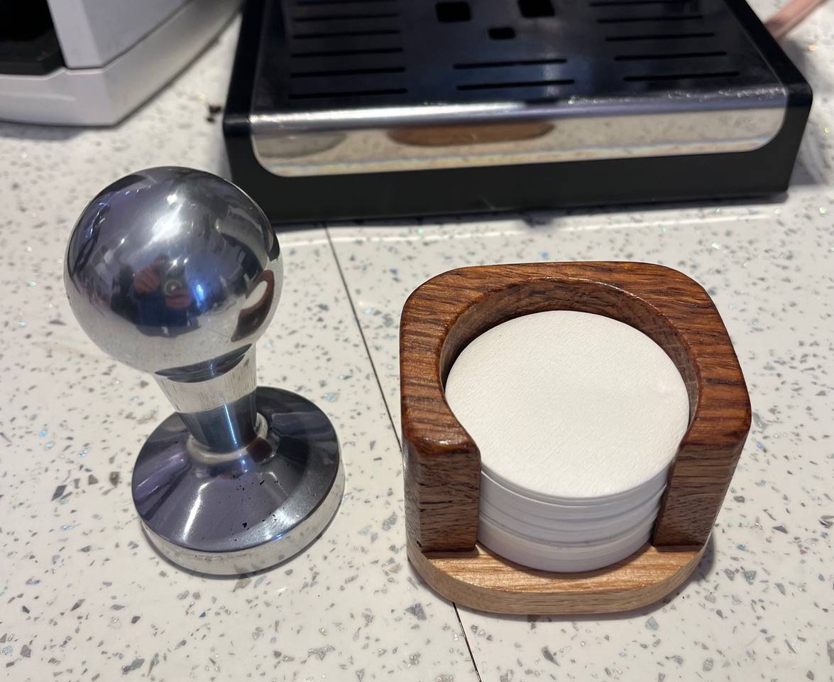 If you’ve been following along with my alcohol restriction, dexa scan visceral fat/cholesterol stuff, you may recall that diterpenes in coffee can raise LDL cholesterol, but are filtered out by paper filters. This has lead me to start using small round paper filters in my espresso machine. They come in horrid little packets, so I’ve been taking sanity-preserving breaks from wiki and blog edits to nip out to my shed and cut up bits of wood. The first such project is a holder for the filters. It’s in brown oak that grew in my garden (for 200 years or so, before being killed by a shed fire before we bought the property. I had it felled and sawn into usable planks), and ash. Nothing fancy, and note to self: hole cutting saws make awful substitutes for a Forstner bit and a pillar drill. But as I don’t have a pillar drill or a 52mm Forstner bit, I had to improvise.
