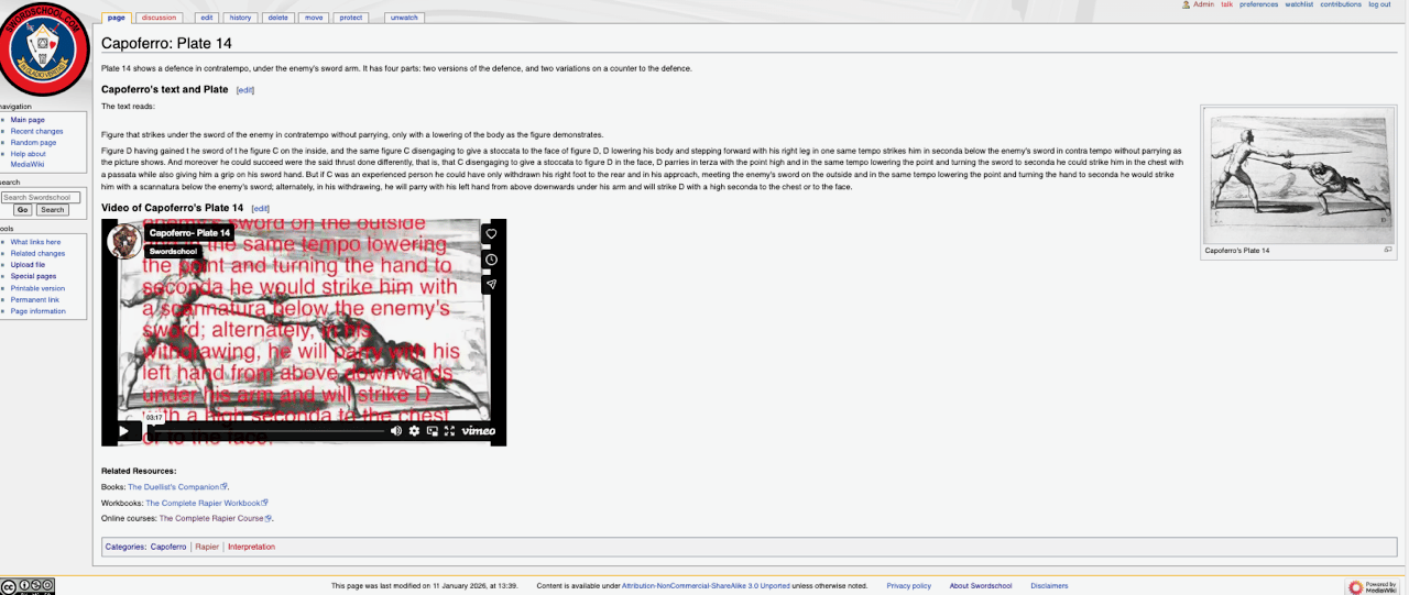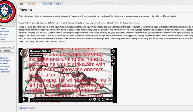 I believe that the Art is everyone’s birthright, and does not belong behind a paywall. I am getting back to basics and getting all my interpretation work out there where people can use it. This is why my translations of Il Fior di Battaglia and De Arte Gladiatoria Dimicandi are already distributed for free, and I’ve got about 400 public videos on my vimeo account. Just getting it out there is not enough though- to be useful it needs to be organised. This is why we have the Syllabus Wiki.